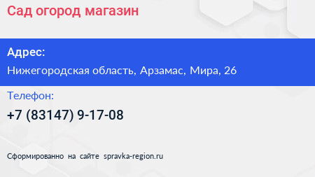 Сад-огород, магазин по адресу Нижегородская область, Арзамас, Мира, 26 в дальнейшем Организация, размещена в следующих категориях: