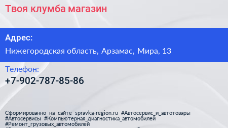 Твоя клумба, магазин по адресу Нижегородская область, Арзамас, Мира, 13 в дальнейшем Организация, размещена в следующих категориях: