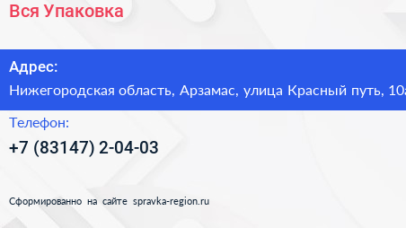 Вся Упаковка по адресу Нижегородская область, Арзамас, улица Красный путь, 10а в дальнейшем Организация, размещена в следующих категориях: