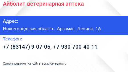 Айболит, ветеринарная аптека по адресу Нижегородская область, Арзамас, Ленина, 16 в дальнейшем Организация, размещена в следующих категориях: