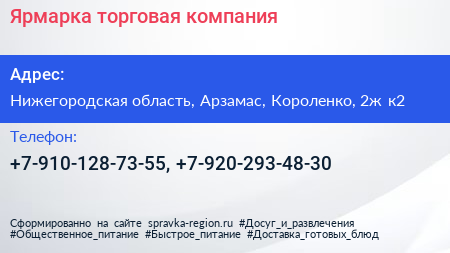 Ярмарка, торговая компания по адресу Нижегородская область, Арзамас, Короленко, 2ж к2 в дальнейшем Организация, размещена в следующих категориях: