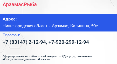 АрзамасРыба по адресу Нижегородская область, Арзамас, Калинина, 50е в дальнейшем Организация, размещена в следующих категориях: