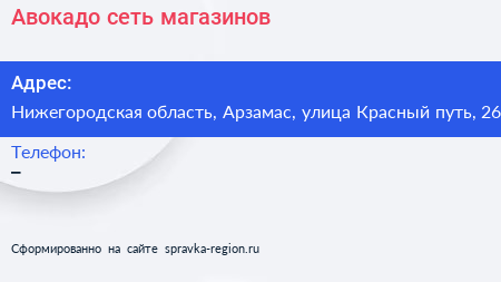 Авокадо, сеть магазинов по адресу Нижегородская область, Арзамас, улица Красный путь, 26 в дальнейшем Организация, размещена в следующих категориях: