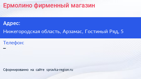 Ермолино, фирменный магазин по адресу Нижегородская область, Арзамас, Гостиный Ряд, 5 в дальнейшем Организация, размещена в следующих категориях: