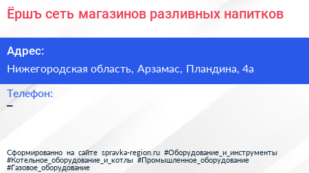 Ёршъ, сеть магазинов разливных напитков по адресу Нижегородская область, Арзамас, Пландина, 4а в дальнейшем Организация, размещена в следующих категориях:
