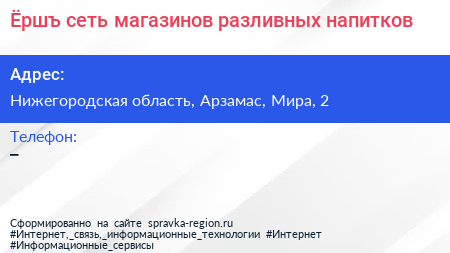Ёршъ, сеть магазинов разливных напитков по адресу Нижегородская область, Арзамас, Мира, 2 в дальнейшем Организация, размещена в следующих категориях: