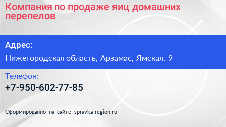 Компания по продаже яиц домашних перепелов по адресу Нижегородская область, Арзамас, Ямская, 9 в дальнейшем Организация, размещена в следующих категориях:
