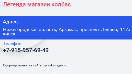 Легенда, магазин колбас по адресу Нижегородская область, Арзамас, проспект Ленина, 117а киоск в дальнейшем Организация, размещена в следующих категориях: