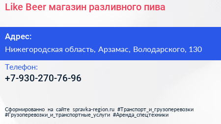 Like Beer, магазин разливного пива по адресу Нижегородская область, Арзамас, Володарского, 130 в дальнейшем Организация, размещена в следующих категориях: