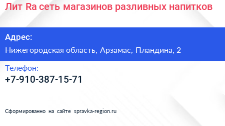 Лит.Ra, сеть магазинов разливных напитков по адресу Нижегородская область, Арзамас, Пландина, 2 в дальнейшем Организация, размещена в следующих категориях: