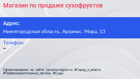 Магазин по продаже сухофруктов по адресу Нижегородская область, Арзамас, Мира, 13 в дальнейшем Организация, размещена в следующих категориях: