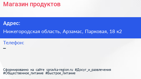 Магазин продуктов по адресу Нижегородская область, Арзамас, Парковая, 18 к2 в дальнейшем Организация, размещена в следующих категориях: