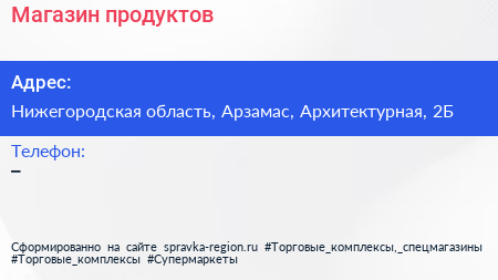Магазин продуктов по адресу Нижегородская область, Арзамас, Архитектурная, 2Б в дальнейшем Организация, размещена в следующих категориях: