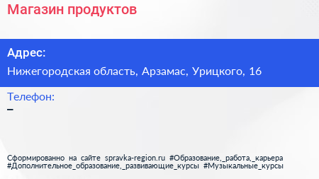 Магазин продуктов по адресу Нижегородская область, Арзамас, Урицкого, 16 в дальнейшем Организация, размещена в следующих категориях: