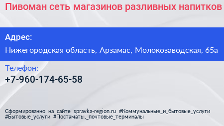 Пивоман, сеть магазинов разливных напитков по адресу Нижегородская область, Арзамас, Молокозаводская, 65а в дальнейшем Организация, размещена в следующих категориях: