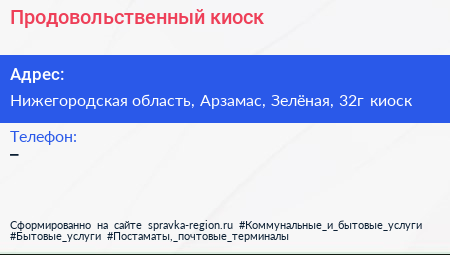 Продовольственный киоск по адресу Нижегородская область, Арзамас, Зелёная, 32г киоск в дальнейшем Организация, размещена в следующих категориях: