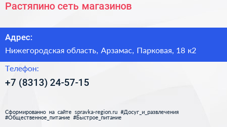 Растяпино, сеть магазинов по адресу Нижегородская область, Арзамас, Парковая, 18 к2 в дальнейшем Организация, размещена в следующих категориях:
