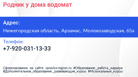 Родник у дома, водомат по адресу Нижегородская область, Арзамас, Молокозаводская, 65а в дальнейшем Организация, размещена в следующих категориях: