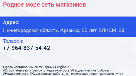 Родное море, сеть магазинов по адресу Нижегородская область, Арзамас, 50 лет ВЛКСМ, 38 в дальнейшем Организация, размещена в следующих категориях: