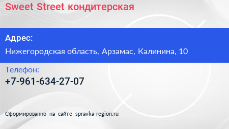 Sweet Street, кондитерская по адресу Нижегородская область, Арзамас, Калинина, 10 в дальнейшем Организация, размещена в следующих категориях: