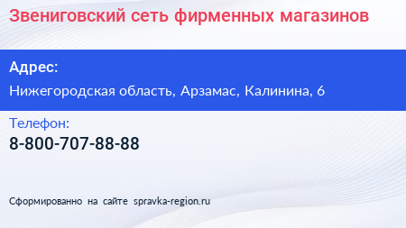 Звениговский, сеть фирменных магазинов по адресу Нижегородская область, Арзамас, Калинина, 6 в дальнейшем Организация, размещена в следующих категориях: