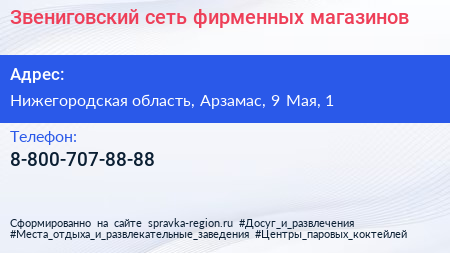 Звениговский, сеть фирменных магазинов по адресу Нижегородская область, Арзамас, 9 Мая, 1 в дальнейшем Организация, размещена в следующих категориях: