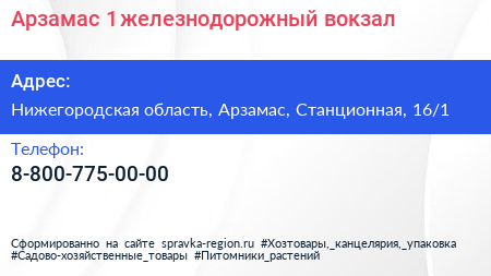 Арзамас-1, железнодорожный вокзал по адресу Нижегородская область, Арзамас, Станционная, 16/1 в дальнейшем Организация, размещена в следующих категориях: