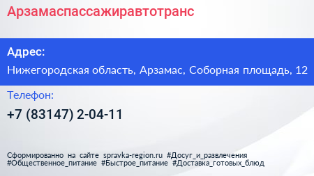 Арзамаспассажиравтотранс по адресу Нижегородская область, Арзамас, Соборная площадь, 12 в дальнейшем Организация, размещена в следующих категориях: