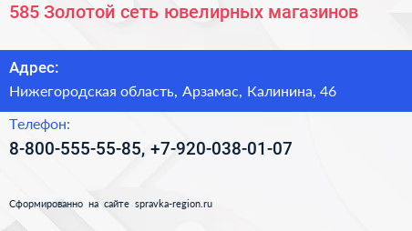 585*Золотой, сеть ювелирных магазинов по адресу Нижегородская область, Арзамас, Калинина, 46 в дальнейшем Организация, размещена в следующих категориях: