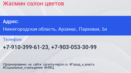 Жасмин, салон цветов по адресу Нижегородская область, Арзамас, Парковая, 1и в дальнейшем Организация, размещена в следующих категориях: