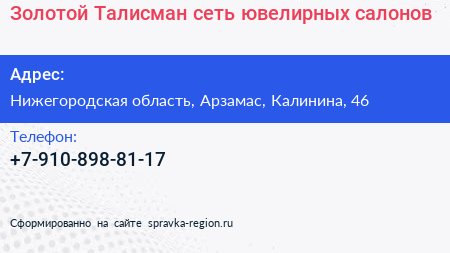 Золотой Талисман, сеть ювелирных салонов по адресу Нижегородская область, Арзамас, Калинина, 46 в дальнейшем Организация, размещена в следующих категориях: