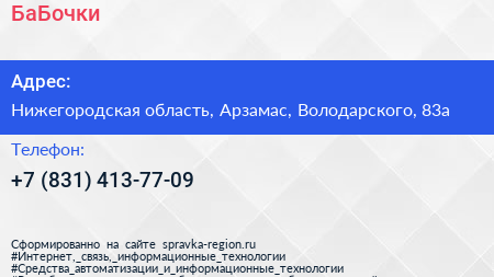 БаБочки по адресу Нижегородская область, Арзамас, Володарского, 83а в дальнейшем Организация, размещена в следующих категориях:
