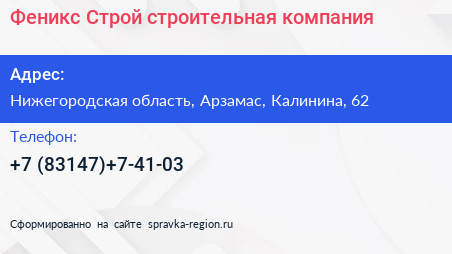 Феникс-Строй, строительная компания по адресу Нижегородская область, Арзамас, Калинина, 62 в дальнейшем Организация, размещена в следующих категориях: