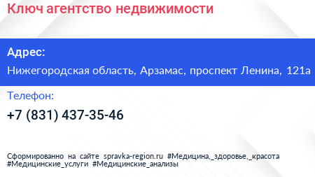 Ключ, агентство недвижимости по адресу Нижегородская область, Арзамас, проспект Ленина, 121а в дальнейшем Организация, размещена в следующих категориях:
