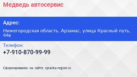 Медведь, автосервис по адресу Нижегородская область, Арзамас, улица Красный путь, 44в в дальнейшем Организация, размещена в следующих категориях: