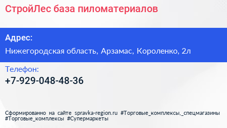СтройЛес, база пиломатериалов по адресу Нижегородская область, Арзамас, Короленко, 2л в дальнейшем Организация, размещена в следующих категориях:
