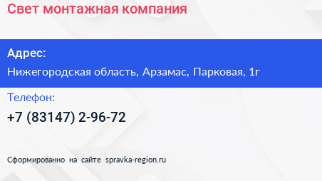 Свет, монтажная компания по адресу Нижегородская область, Арзамас, Парковая, 1г в дальнейшем Организация, размещена в следующих категориях:
