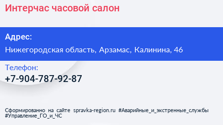 Интерчас, часовой салон по адресу Нижегородская область, Арзамас, Калинина, 46 в дальнейшем Организация, размещена в следующих категориях: