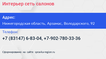 Интерьер, сеть салонов по адресу Нижегородская область, Арзамас, Володарского, 92 в дальнейшем Организация, размещена в следующих категориях: