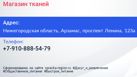 Магазин тканей по адресу Нижегородская область, Арзамас, проспект Ленина, 123а в дальнейшем Организация, размещена в следующих категориях:
