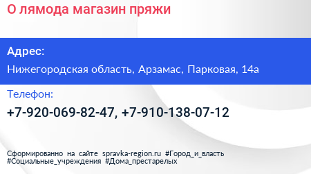 О`лямода, магазин пряжи по адресу Нижегородская область, Арзамас, Парковая, 14а в дальнейшем Организация, размещена в следующих категориях: