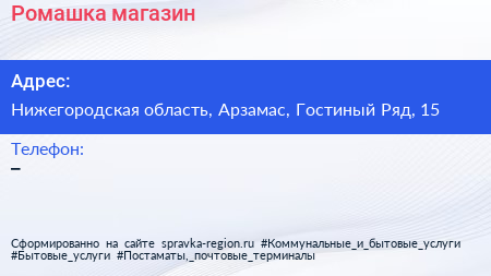 Ромашка, магазин по адресу Нижегородская область, Арзамас, Гостиный Ряд, 15 в дальнейшем Организация, размещена в следующих категориях: