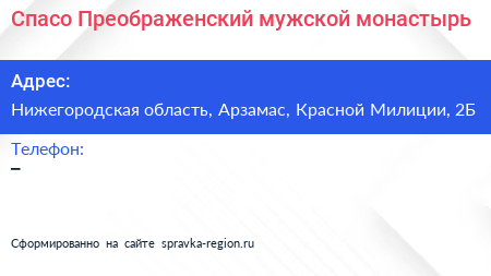 Спасо-Преображенский мужской монастырь по адресу Нижегородская область, Арзамас, Красной Милиции, 2Б в дальнейшем Организация, размещена в следующих категориях: