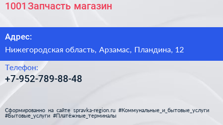 1001 Запчасть, магазин по адресу Нижегородская область, Арзамас, Пландина, 12 в дальнейшем Организация, размещена в следующих категориях: