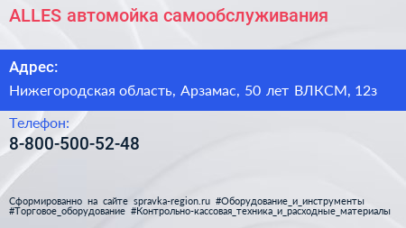 ALLES, автомойка самообслуживания по адресу Нижегородская область, Арзамас, 50 лет ВЛКСМ, 12з в дальнейшем Организация, размещена в следующих категориях: