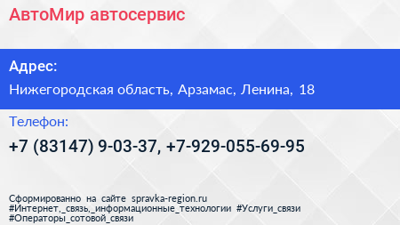 АвтоМир, автосервис по адресу Нижегородская область, Арзамас, Ленина, 18 в дальнейшем Организация, размещена в следующих категориях: