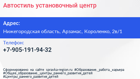 Автостиль, установочный центр по адресу Нижегородская область, Арзамас, Короленко, 2в/1 в дальнейшем Организация, размещена в следующих категориях: