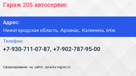 Гараж 205, автосервис по адресу Нижегородская область, Арзамас, Калинина, 64ж в дальнейшем Организация, размещена в следующих категориях:
