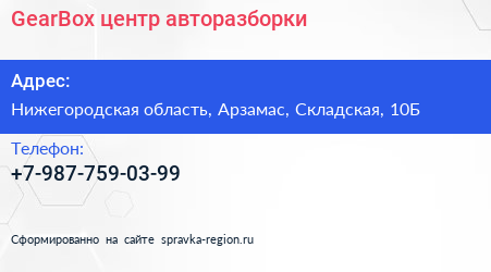 GearBox, центр авторазборки по адресу Нижегородская область, Арзамас, Складская, 10Б в дальнейшем Организация, размещена в следующих категориях: