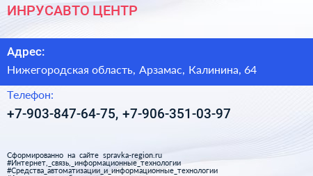 ИНРУСАВТО-ЦЕНТР по адресу Нижегородская область, Арзамас, Калинина, 64 в дальнейшем Организация, размещена в следующих категориях: